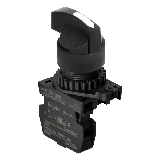 The S2SR round, extended type Ø22/25 mm selector switches are designed for smooth operation and maneuverability, featuring shark-head lever designs. They provide reliable performance in various industrial applications.
