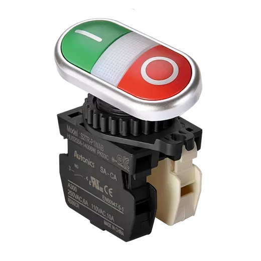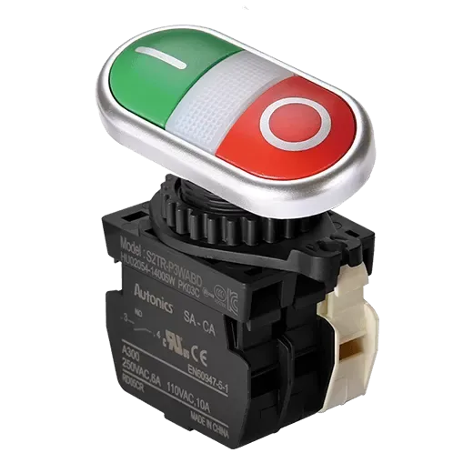 Autonics S2TR Series double push buttons integrate two spring-return actuators in one compact body for start/stop and ON/OFF functions. The non-illuminated model S2TR-P1WAB uses a standard contact block, while illuminated models add an LED block as either AC 110–220 VAC (S2TR-P3WABL) or DC 12–30 VDC (S2TR-P3WABD), keeping identical switching contact ratings.