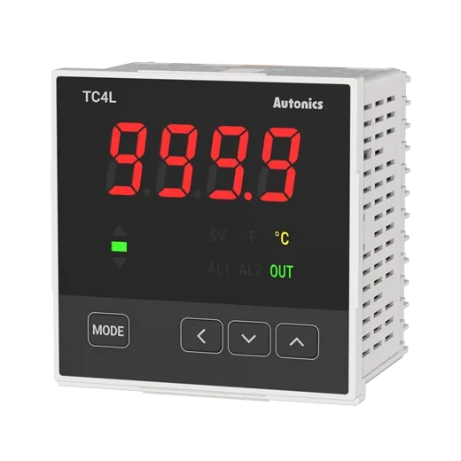 The TC4 series single display PID temperature controllers by Autonics present a combination of exceptional performance and cost efficiency. These controllers boast a high-speed sampling rate of 100 ms along with a display accuracy of ±0.5%. Supporting both relay output and SSR drive output, the TC series models offer versatility and seamless switching between Process Value (PV) and Setting Value (SV). The bright LED displays, featuring large characters, ensure effortless and clear value readings for enhanced readability.