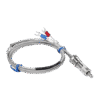 The Pt100 RTD temperature sensor offers an accuracy of +/-0.3°C at 0°C. The KNE terminal head is constructed from aluminum alloy with a silver painted finish and has an ingress protection rating of IP68. The lid of the terminal head is secured with a stainless steel chain.